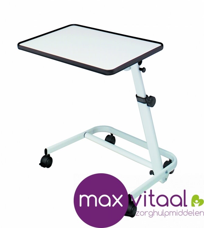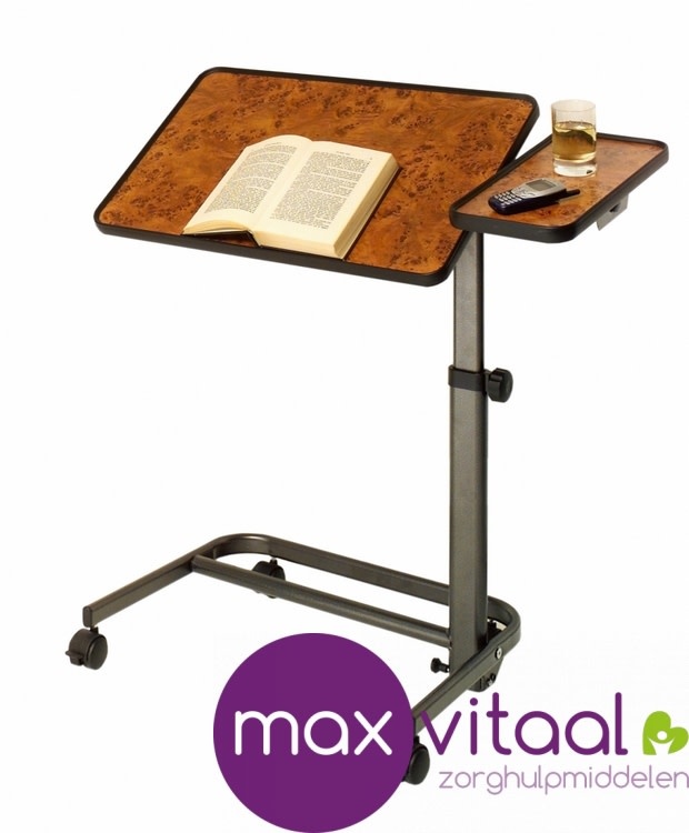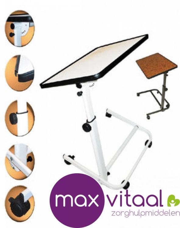 Kwalitatief hoogwaardige bedleestafel. Het werkblad is kantelbaar in 6 posities. Met zwarte opstaande rand rond het werkblad om te voorkomen dat er spullen wegglijden. Het staande frame is kantelbaar in 3 posities. Inclusief 2 geremde wielen. Plateau is optioneel.