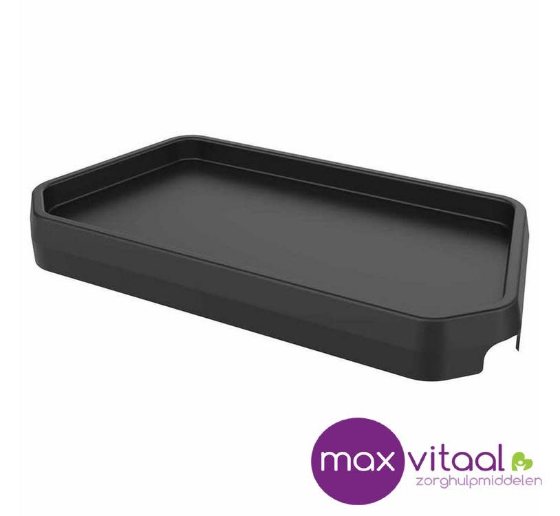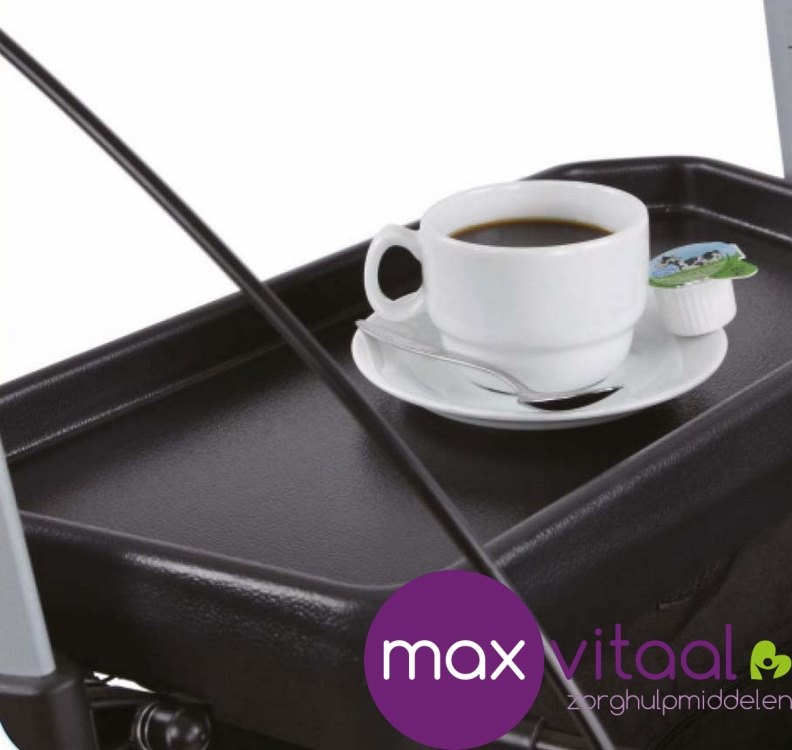 Het dienblad kan eenvoudig op de zitting van de rollator bevestigd worden. Hoge randen en een antislip oppervlak maken het veilig om eten en drinken te vervoeren.