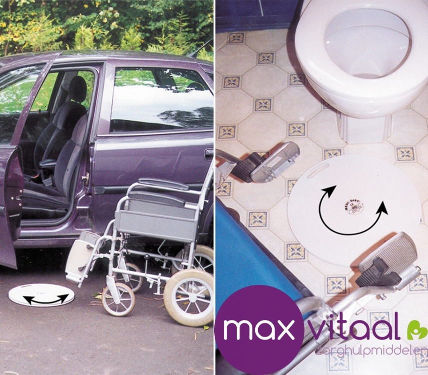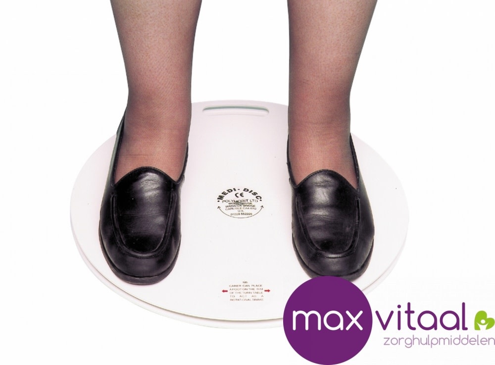 Een lichtgewicht draaischijf voor een vloeiende draaiende beweging tijdens een transfer. De verzorger kan het draaien blokkeren (afremmen) door met de voet de flexibele rand van de schijf licht in te drukken. Voorzien van handvat en antisliplaag aan de onderzijde.