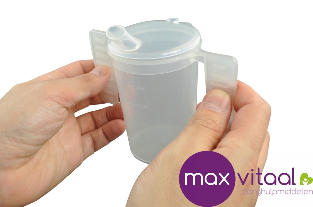 Deze drinkbeker heeft lange en platte handgrepen. Er worden twee tuitdeksels meegeleverd. Een deksel met een smalle opening en een met een brede opening. Lees meer