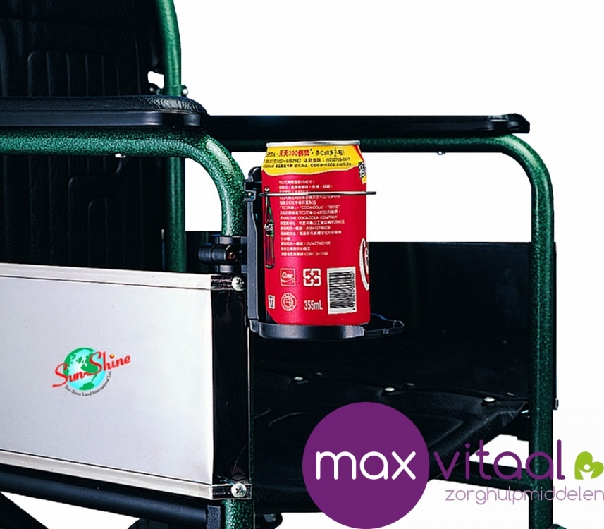 Plastic fleshouder voor bekers en flessen. Eenvoudig aan de rolstoel te bevestigen. Inklapbaar. Diameter 7 cm.
