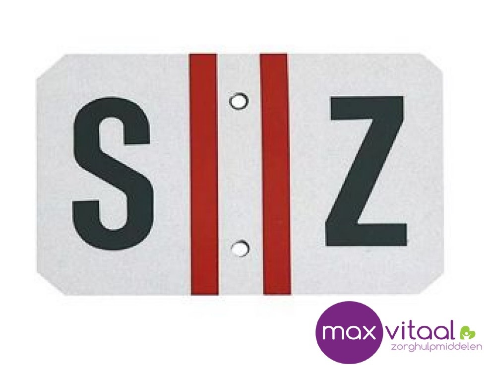 Metalen herkenningsplaatje slechtzienden voor bevestiging op een fiets, rolstoel of rollator. Met witte ondergrond, 2 rode strepen en de letters S en Z. Inclusief 2 bevestigingsgaatjes, exclusief bevestigingsmateriaal.
