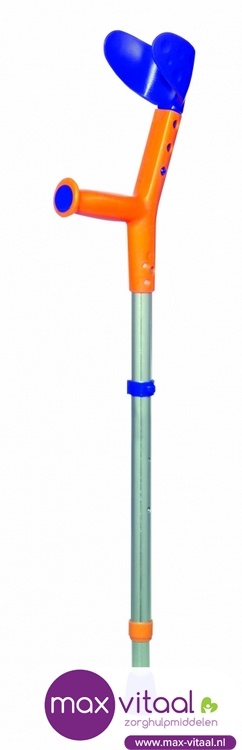Sterk lichtgewicht aluminium kinderkruk in de kleur blauw/oranje. Open manchet. De kruk is verstelbaar van 55 tot 75 cm en de armsteun van 11 tot 21 cm. Leverbaar per stuk.