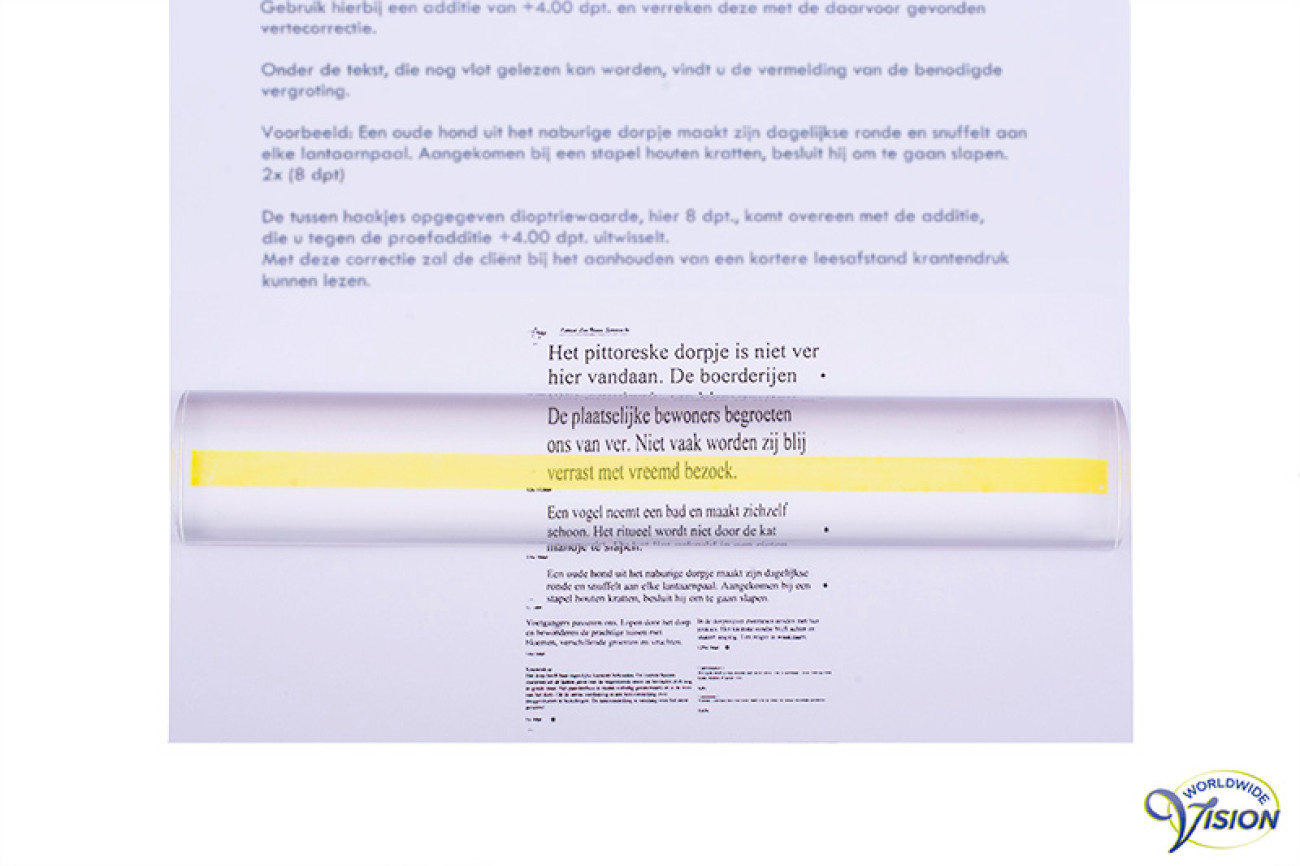 Leesliniaal 15 x 2,5 cm, vergroot 1,5 maal. Dankzij de gele markeringslijn in het midden wordt de regel waarin gelezen wordt visueel benadrukt, wat helpt bij het volgen van de tekst en het voorkomen van regelverlies.