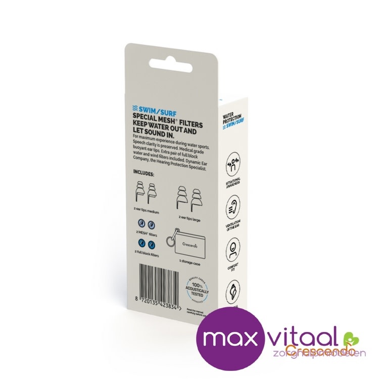 Voor maximale beleving tijdens watersport. Ontworpen om te voorkomen dat er grote hoeveelheden water in de gehoorgang komt. Blokkeert water terwijl u bewust blijft van uw omgeving. Vermindert het risico op oorontsteking en surfer’s ear. Er is een extra paar full block water- en windfilter bij inbegrepen. Gemaakt van zeer zacht medisch materiaal. Goed te reinigen.