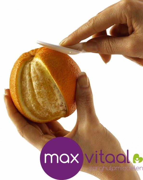 s Werelds makkelijkste sinaasappelschiller. Werkt als een mes maar de vleugels zorgen ervoor dat er niet te diep in het vruchtvlees wordt gesneden. Veilig voor kinderen.