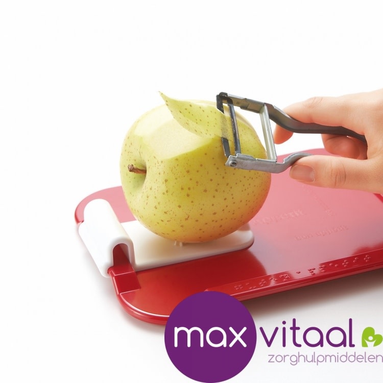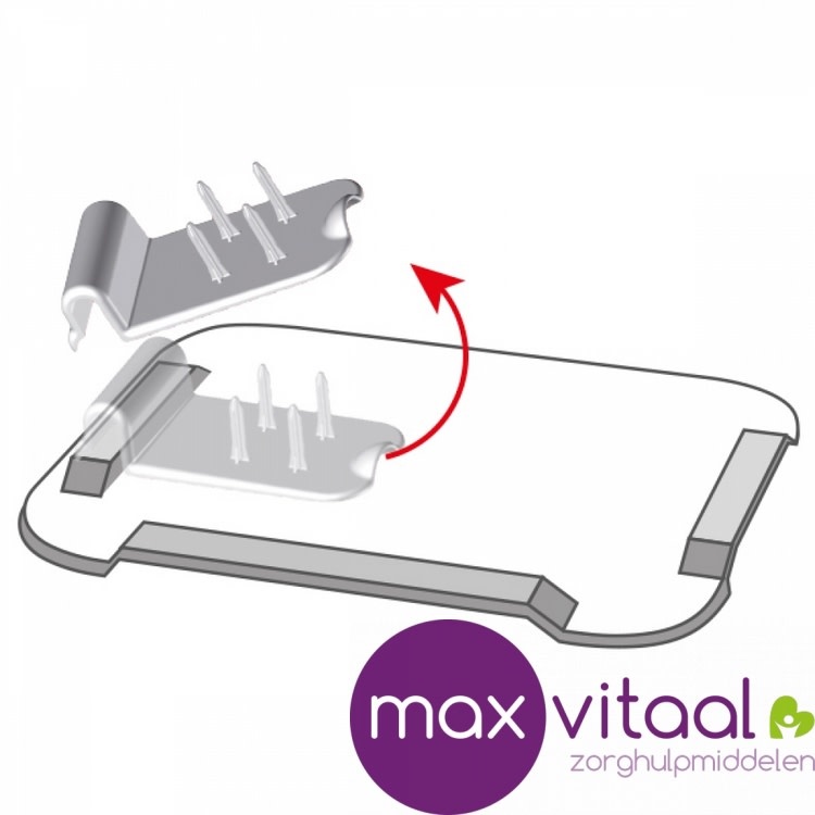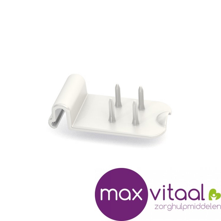 Met de los verkrijgbare clip met pinnetjes is bereiding van broodjes, fruit of groenten met één hand mogelijk. De clip is eenvoudig op een opstaande rand van het bord te plaatsen. (zie opties)