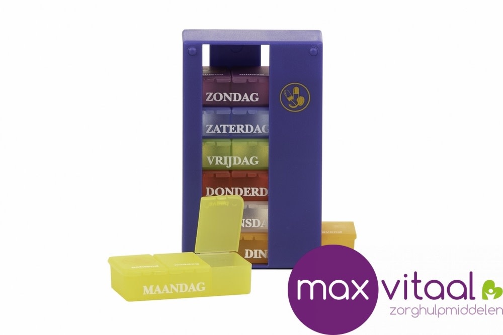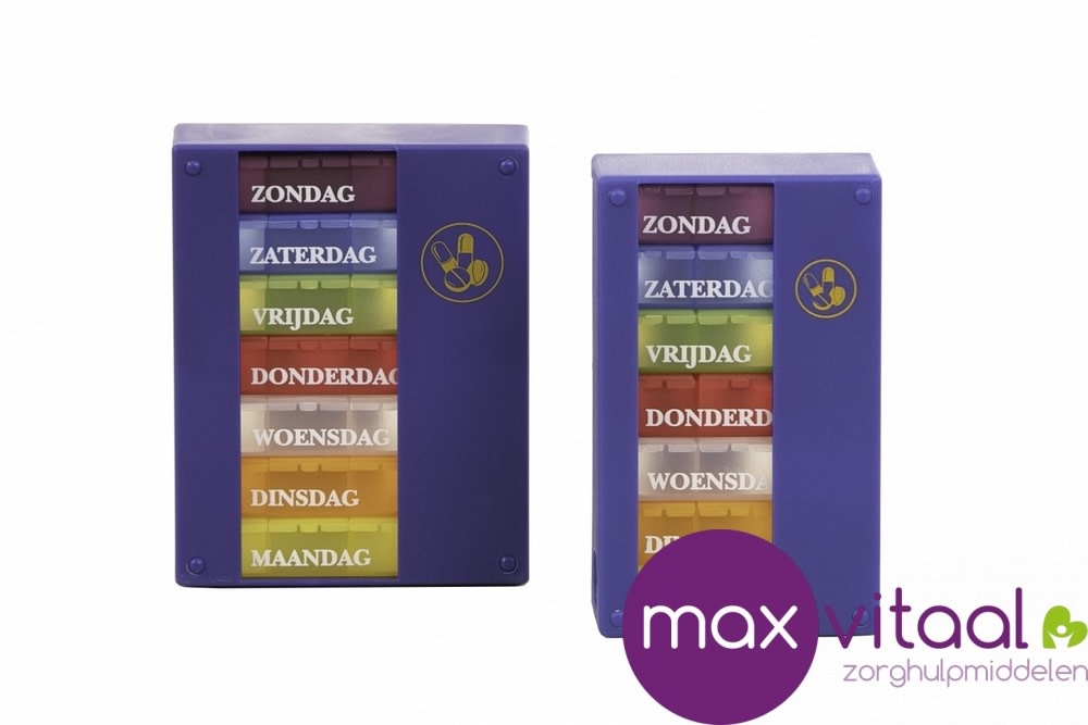 Met de pillenbox 1 week houdt u overzicht over pillen en tabletten die u of iemand anders moet innemen in een bepaalde periode. De pillenbox heeft 7 dagdoosjes voor de zeven dagen van de week. Ieder dagdoosje heeft een aantal vakjes voor bepaalde tijdstippen. Er zijn twee verschillende modellen: 4- vaks en 3-vaks.