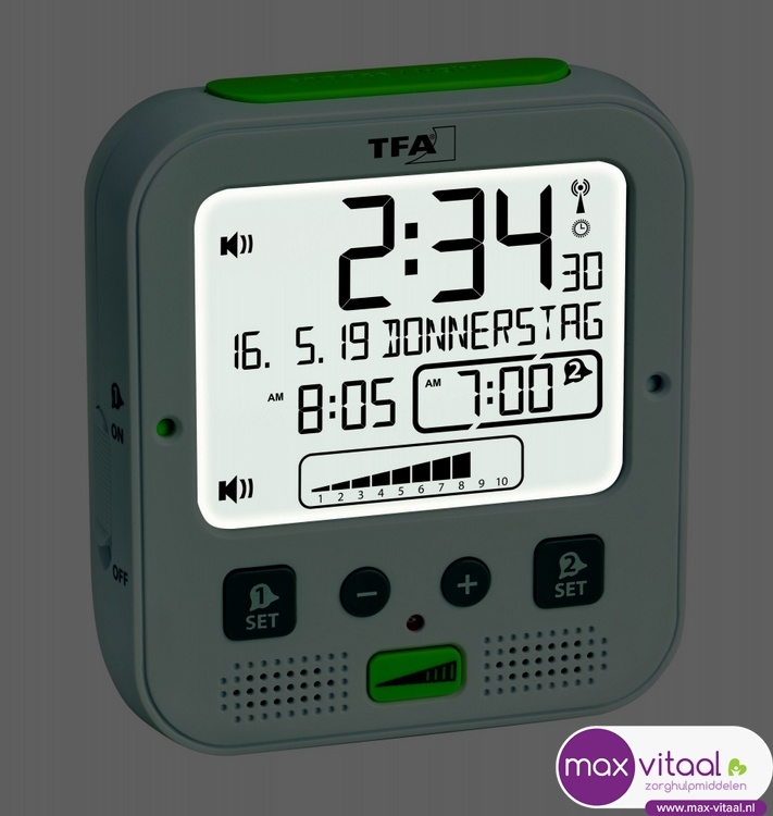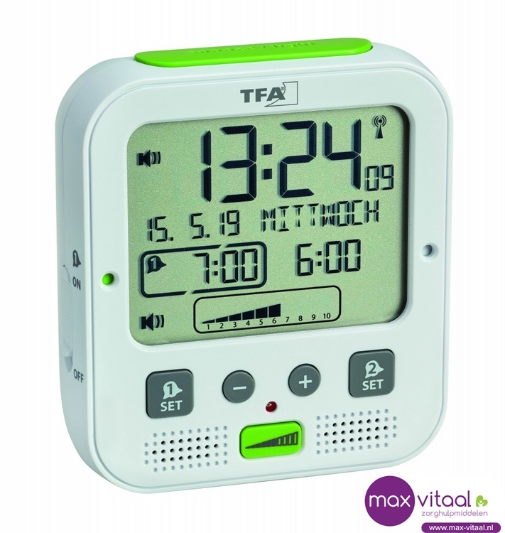 Verslapen is verleden tijd! De draadloze alarmklok wekt u, zelfs als u een vaste slaper bent of slechthorend! De wekker heeft een extra harde alarmtoon, een lichtalarm en een aparte trilunit. Alle alarmfuncties kunnen tegelijkertijd of apart worden ingesteld. Volume en helderheid zijn ook aan te passen. De trilunit is aan de wekker verbonden met een kabel (lengte 1,95 m) en kunt u onder uw kussen of laken plaatsen. Het is mogelijk om twee verschillende alarmtijden in te stellen met ieder een aparte toon. Schuif het alarmknopje aan de zijkant omhoog. Het rode lampje geeft aan dat het alarm is geactiveerd.