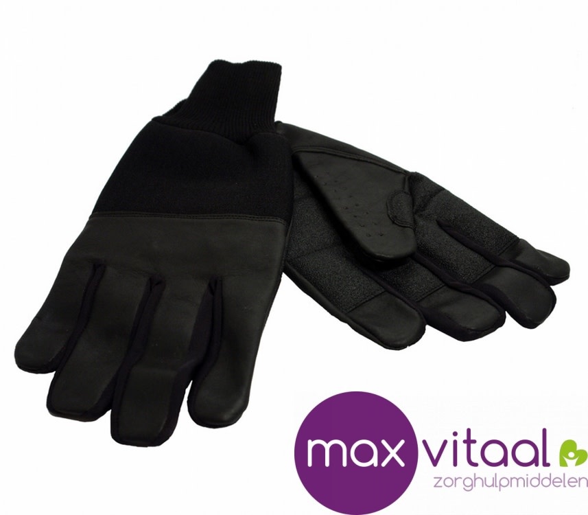 Echt lederen handschoenen met een dichte duim en dichte vingers. Met verlengd polsmanchet voor een winddichte aansluiting. Voorzien van extra grip op de handpalm voor maximale houvast. De combinatie van leer en neopreen geeft een optimaal draagcomfort. Op verschillende plaatsen zijn extra verstevigingen aangebracht speciaal voor rolstoelgebruik.
