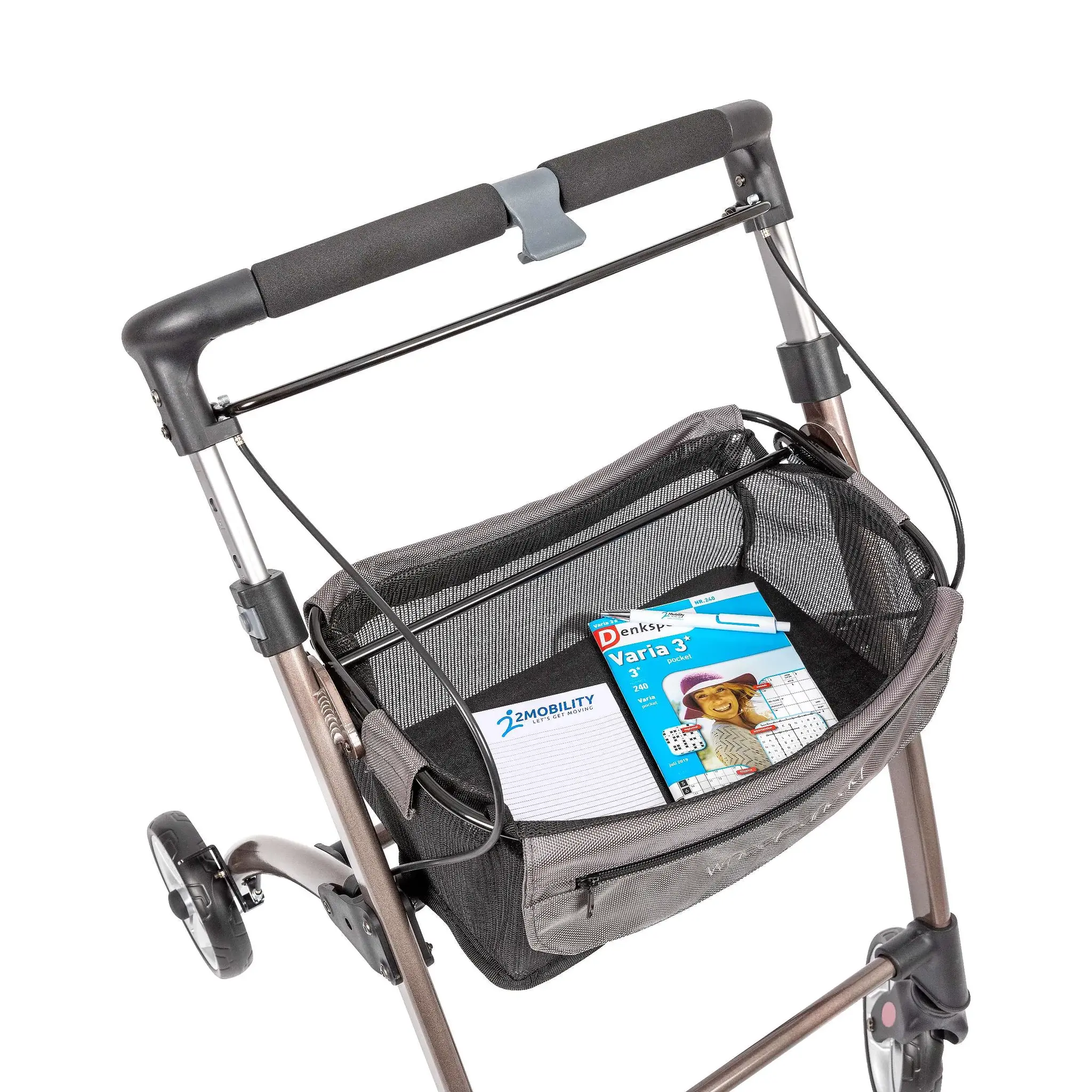 De binnen rollator wordt standaard geleverd met handige opbergmand en dienblad. Zo kunt u eenvoudig uw spullen meenemen, terwijl uw handen vrij blijven.
