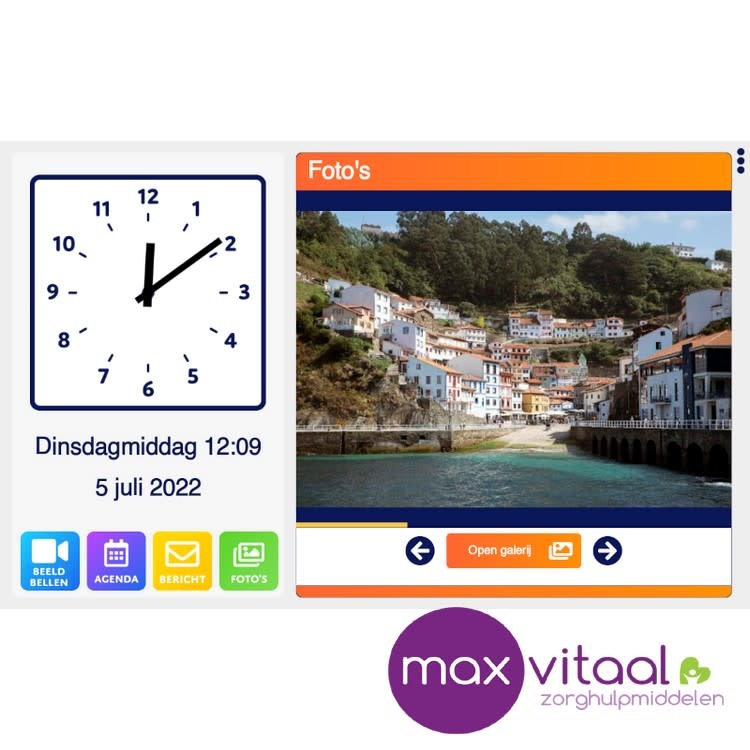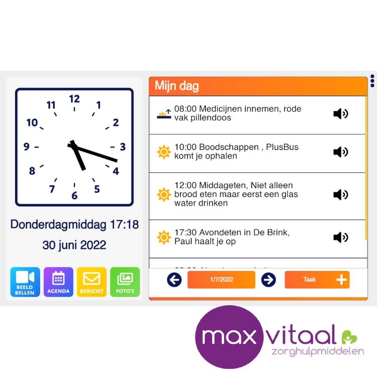 Het gebruiksvriendelijke aanraakscherm van de Dagwijzer helpt je door de dag heen. De Dagwijzer is een klok, kalender en communicatiemiddel in één. Met handige informatie over alle afspraken en taken die gepland staan weet je met een blik op het scherm direct waar je aan toe bent. Daarnaast zijn dierbaren altijd dichtbij: de Dagwijzer helpt jou om op eenvoudige wijze een beeldbelverbinding tot stand te brengen. Handig in geval van nood, maar ook om gewoon even bij te kletsen. Zo blijf je gemakkelijk met al je dierbaren verbonden.