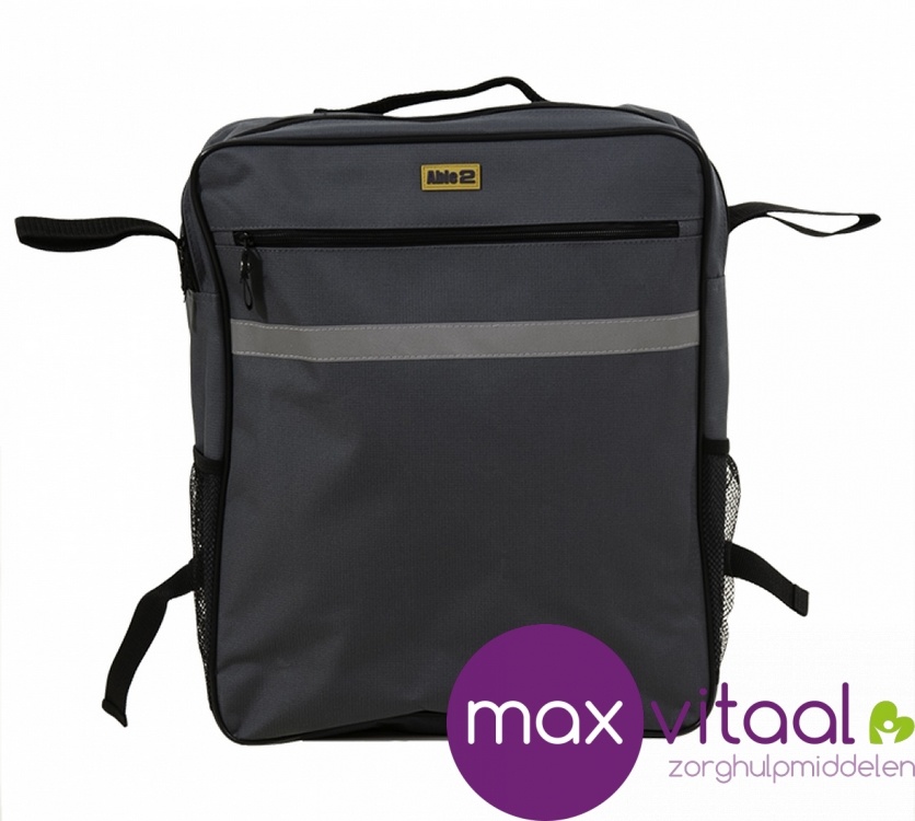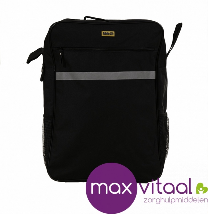 Stevige en duurzame tas voor rolstoel of scootmobiel met of zonder hoofdsteun. Één groot opbergvak, een klein voorvakje met rits. De twee zijnetjes zijn ideaal voor het opbergen van een flesje drinken. Reflecterende veiligheidsstrip.