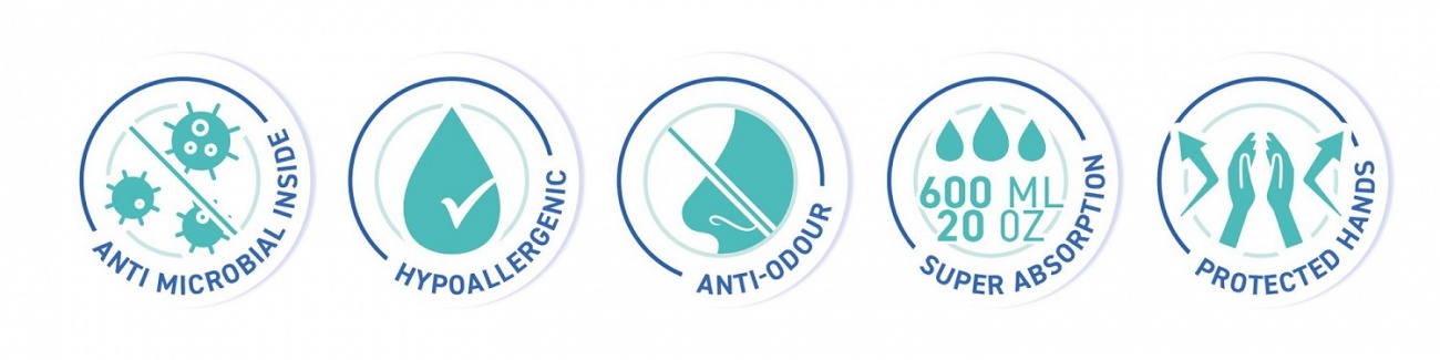 Deze kwalitatieve opvangzakken zorgen voor een veilige en hygiënische opvang van urine, ontlasting en braaksel. De opvangzakken zijn voorzien van super absorberende inleggers die de uitscheiding omzet in een vaste gel (600 ml) en die tevens de geur neutraliseert.