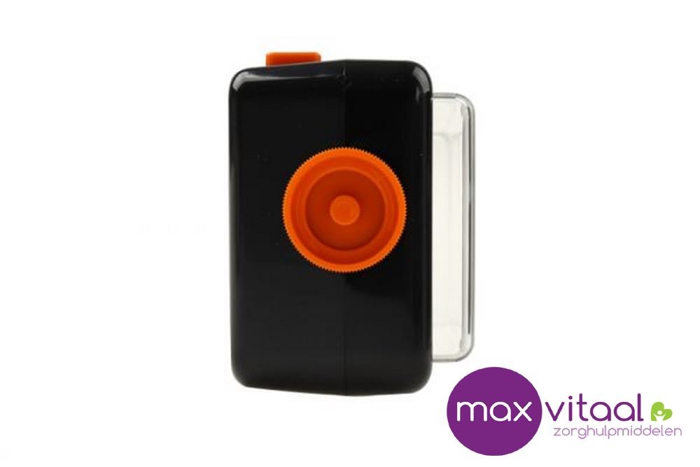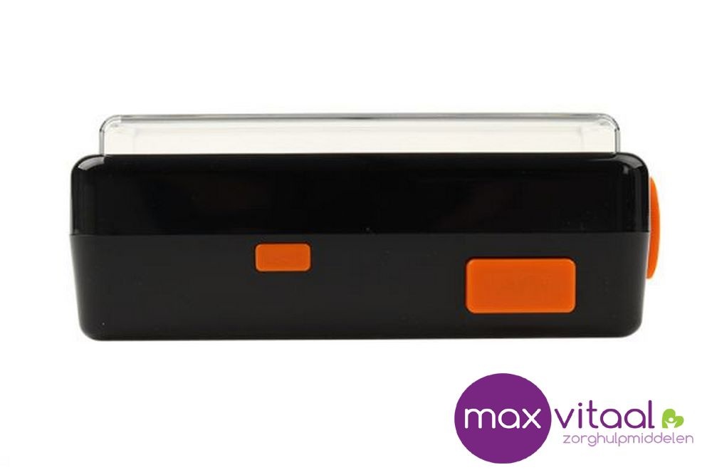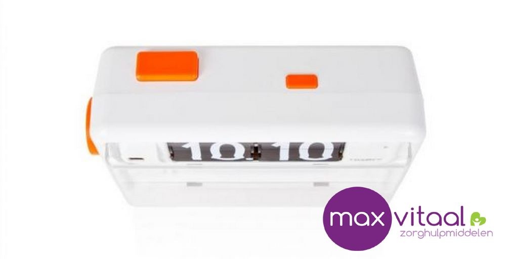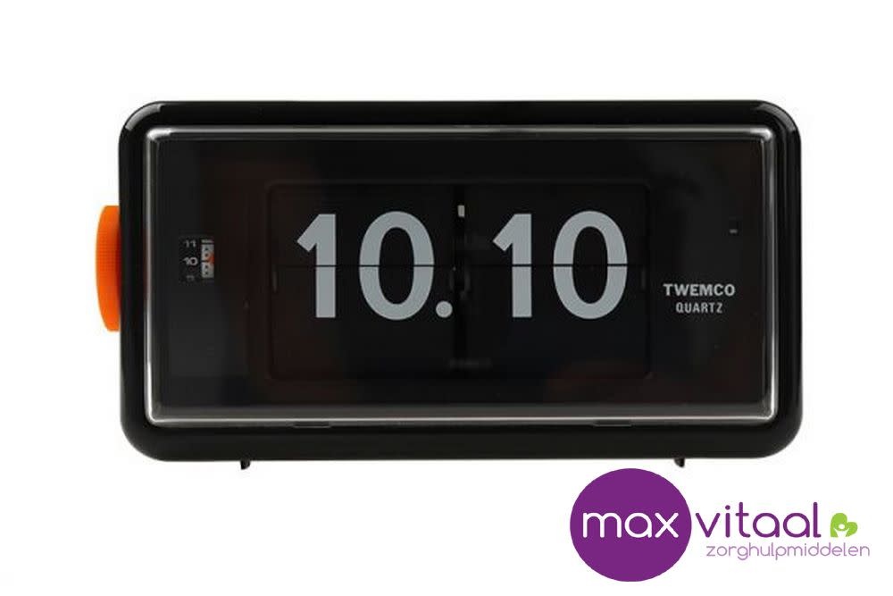 Compacte Twemco alarmklok voor senioren en slechtzienden. De klok heeft digitale, witte valcijfers van 3 cm hoog op een zwarte achtergrond. Inclusief bedienbare verlichting en alarm met beepsignaal.